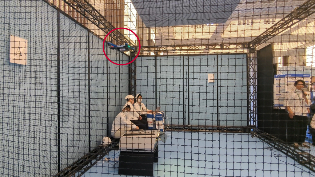写真:展示エリアの概況(ネットに囲われた範囲がデモエリア、デモエリア中央に設置されているものが「Skydio Dock」)